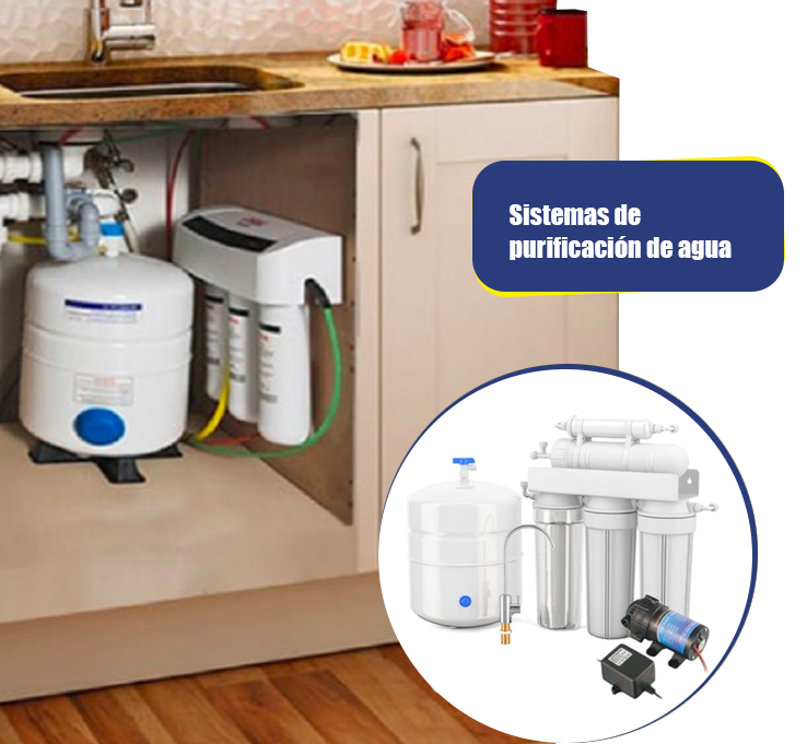 Sistemas domésticos de purificadores de agua con osmosis inversa para consumo del hogar.